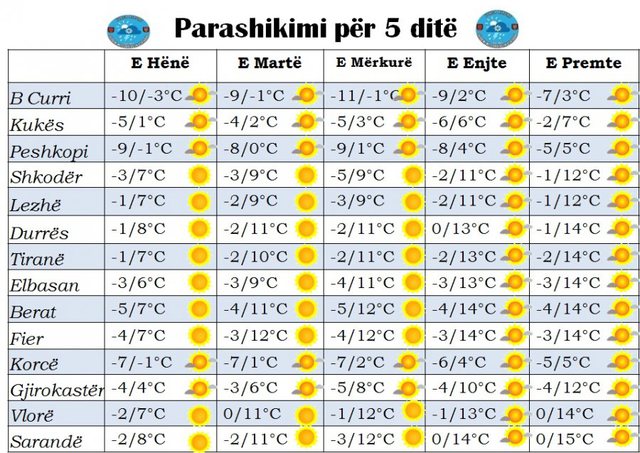 Për javën që presim përpara vendi ynë do të ndikohet nga masa ajrore të acarta me origjinë verilindore (siberiane) me temperatura që do të ‘mbërthehen’ në vlera negative në pjesën më të madhe të territorit.