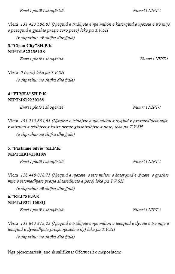 Firma fituese, “ALKO IMPEX” ofroi 129.808.930 lekë pa TVSH. Një ofertë shumë afër fondit limit. Në tender kanë marrë pjesë edhe firma të tjera, me fonde të përafërta, ndërkohë që disa prej tyre ofruan “0 lekë”. Një skemë për të larguar të tjerat dhe për t’ia dhënë tenderin firmës së nipit të ish-deputetit Sadri Abazi. Oferta më e ulët ka qenë e firmës “Pastrime Silvio” me një ofertë prej 128.446.018 lekë pa TVSH. Një shumë 18 milionë lëkë më pak sesa oferta e firmës fituese. Normalisht, në një procedurë normale fituesi duhet të ishte oferta më e ulët, por në këtë rast, në ikje të Gurmës, fituesi është oferta më e lartë, ajo që është shumë afër fondit limit.