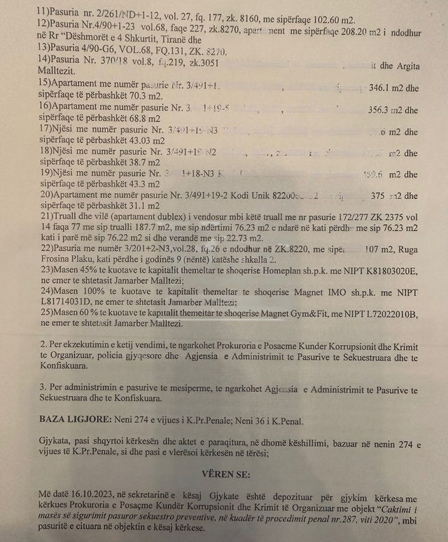 Gjithashtu Malltezit i janë sekuestruar 6 llogari bankare dhe 45% të kuotave në emër të tij në shoqërinë Homeplan, 60% të kuotave në emër të tij të shoqërisë Magnet Gym&Fit.