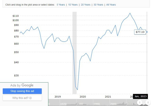“Çmimet e naftës ne bote vetëm bien (sot shkoi 77 USD për fuçi). Rënia po i afrohet çmimit te para-Luftës (70 USD për fuçi). Ne Shqipëri ato ndryshojnë brenda orës vetëm kur rriten, por harrojnë te ulen më… Para Luftës Nafta ishte 140 L/Litri, sot duhet te ishte maksimumi 160 L/Litri me rregull treshi… (Brent crude futures for the March contract had fallen to $77.10 a barrel, a 3.5% loss. WTI, the American benchmark, was down over 3.2%, falling to $74.47 per barrel. On Tuesday, both benchmarks plunged more than 4%.)