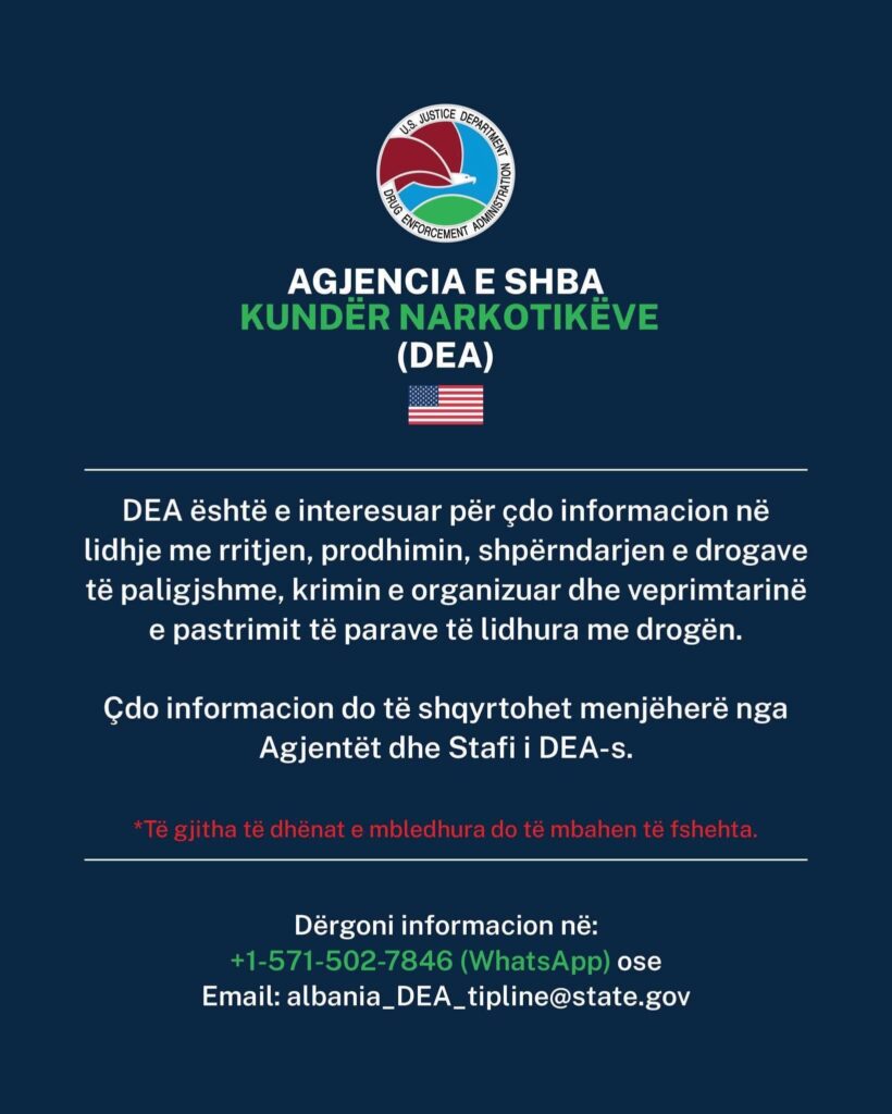 Sipas njoftimit, kushdo që disponon të dhëna të rëndësishme mund të kontaktojë drejtpërdrejt personelin e DEA-s nëpërmjet WhatsApp në numrin: +1 571 502-7846 ose në adresën e emailit albania_DEA_tipline@state.gov.