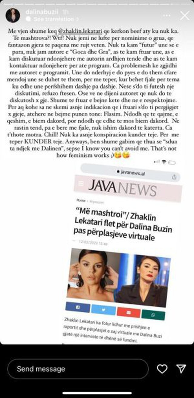 “Dalina është një profesioniste, e zonja në fushën e saj. Në fakt ne nuk kemi më kontakt nga “Goca dhe Gra” sepse unë kam qenë e ftuar pas ngjarjes që ndodhi me Fifin. Dhe me thënë të drejtën nuk u prita shumë mirë në atë emision, u ndjeva shumë e sulmuar. U ndjeva e mashtruar. Isha ftuar për të biseduar për një temë, u bisedua një temë tjetër. Dola shumë e zhgënjyer nga ky kurth që mu bë në një emision dhe prej atij momenti kam vendosur mos të komentoj dhe ndjek aktivitetin e saj sepse nuk e shoh të arsyeshme ta bëj. Nuk dua fare.”– tha Lekatari, natyrisht duke u bërë lajm në portalet dhe mediat e showbiz-it. E pikërisht nisur nga një titull i këtyre të fundit është nisur Dalina për të bërë një reagim të gjatë në Instagram-in e saj, duke ju drejtuar për herë të parë gazetares që prej programit ku ishte e ftuar, duke bërë këtë deklaratë si më poshtë: