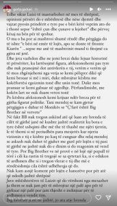 Nuk kam asnjë koment për lojën e banorëve por për atë që ndodh jashtë shtëpisë. Juve mbështetësve të Luizit që do vërshoni nga mesazhet ju them se nuk jam për të mbrojtur një palë apo për të gjykuar një palë, por jam thjesht e indinjuar për të ardhmen e vendit tim. Big Brother jemi ne jashtë, jo ata atje brenda.”