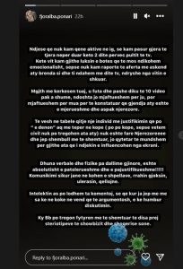 “…gjendja aty është e mjerueshme dhe aspak njerëzore. Të vesh në tabelë qitje një individ me justifikimin që po “e dënon” aq më tepër në kope (po, po kope, sepse vetëm cilin nuk po tregohen ata aty) nuk është fare njerëzore dhe jep shembull më të shëmtuar, jo qytetar të mundshëm për të gjithë ata që i ndjekin e influencohen nga ekrani. Dhuna verbale dhe fizike pa dallime gjinore është absolutisht e patolerueshme dhe e pajustifikueshme! Komunikimi sikur janë në kohën e shpellave, rrahin gjoksin, ulërain, qëllojnë. Intelektin as po lodhem ta komentoj, se që kur ja jep me sa ken ë kokë në vend që të argumentosh, e ke humbur diskutimin. Ky BB po tregon fytyrën më të shëmtuar të disa prej stereotipeve të showbizit dhe shoqërisë sonë”, shkruan Fjoralba.