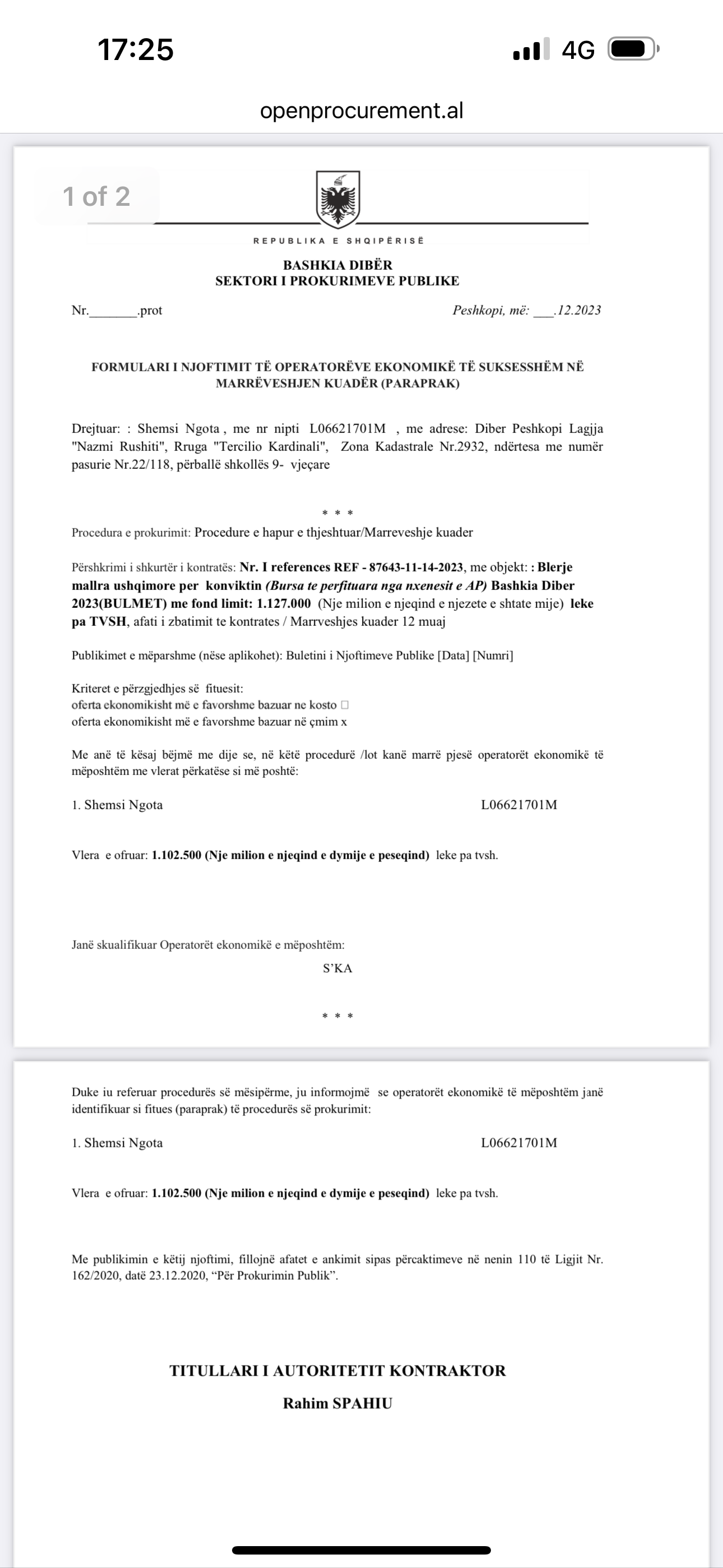 Tenderi i fituar kundrejt një oferte rreth 12 mijë euro nga subjekti Shemsi Ngota, por kjo ka pak rëndësi. Po ashtu, pak rëndësi ka edhe shuma, pasi trefishin e kësaj, Rahim Spahiu nuk e ka mbledhur dot vetëm nga taksa e tokës në Dibër (detaje që do t’i raportojmë më vonë krahas bëmave të tjera) por problemi qendron pikërisht te fakti se: ÇFARË DO TA BËJË BASHKIA DIBËR NJË SASI KAQ TË MADHE QUMËSHTI?! A PO E BLEN VËRTETË APO THJESHT PO QARKULLON FATURAT?!
