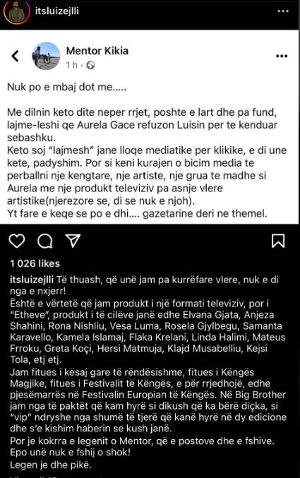 Një shkrim i gazetarit Mentor Kikia në rrjetin social Facebook, ku kritikonte mediat se si e ballafaqojnë këngëtaren Aurela Gace me Luiz Ejllin, pasi sipas tij Big Brother është produkt televiziv pa asnjë vlerë, duke përfshirë këtu edhe banorët e saj, ka sjellë një reagim të ashpër në rrjetet sociale të fituesit të BBVIP.