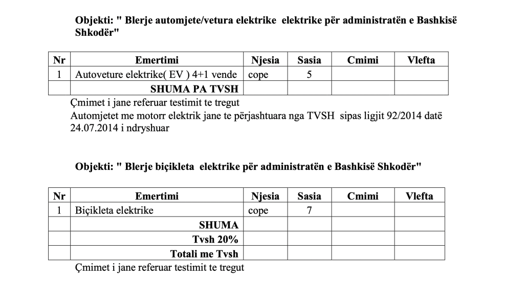 Bashkia Shkodër ka hapur një tender për blerjen e makinave dhe biçikletave elektrike për llogari të bashkisë me një fond limit rreth 170 milionë lekë të vjetra me TVSH. Nga këto, pjesa dërrmuese, janë para për makinat.
