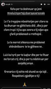 Në postimin në “Instastory” shkruhet ndër të tjera se Luizi ka hyrë për të luajtur dhe për të fituar me forcat e tij dhe jo për t’u mëshiruar për asnjë lloj arsye.