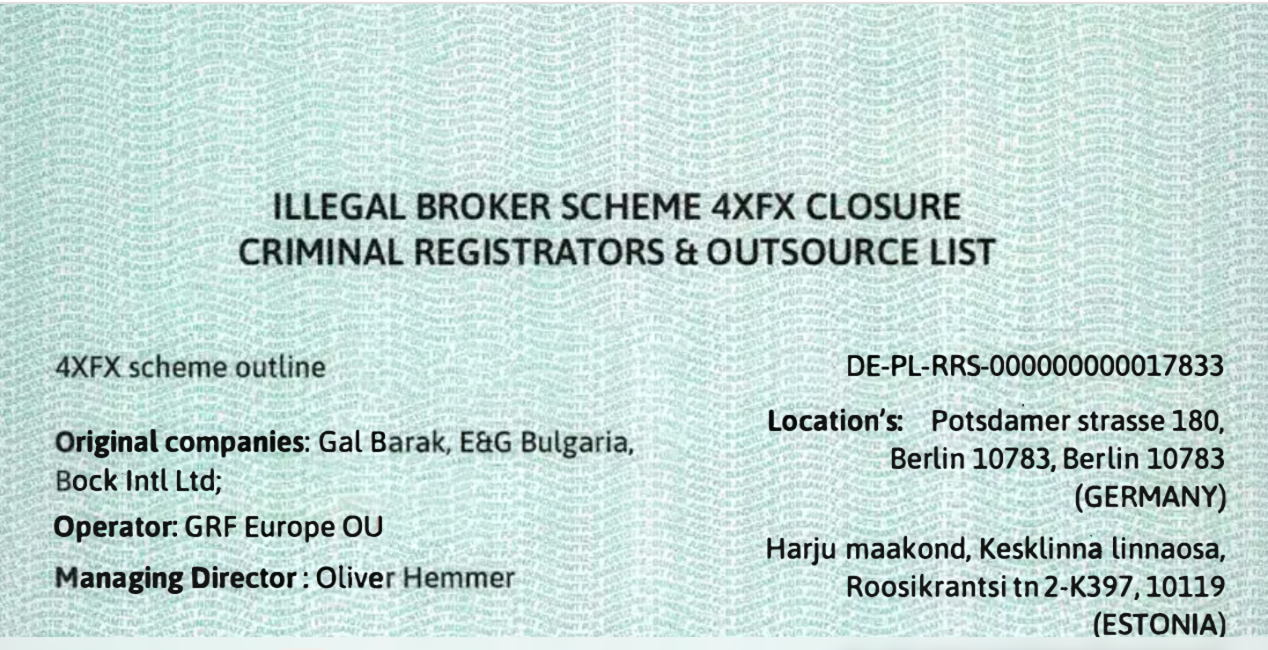 I veti informacion relevant për Oliver Hemmer, është një material i vitti 2019 ku thuhet se zyrtarët federalë po hetojnë një kompani të paregjistruar me seli në Berlin të Gjermanisë, të quajtur Gal Blocklntl Ltd (platforma “4XFX”), e cila vepronte pa autorizimin e duhur. Sipas materialit, drejtori menaxhues i kompanisë, Oliver Hemmer, po drejtonte një skemë mashtrimi të quajtur “4XFX” dhe se ai po hetohej gjithashtu si përfituesi kryesor. Në lidhje me këtë çështje janë paraqitur raporte për kompaninë në Mbretërinë e Bashkuar, Spanjë dhe Estoni, dhe Australi. (https://www.scribd.com/document/714449499/report-for-the-fraudulent-activities-4xfx-com)