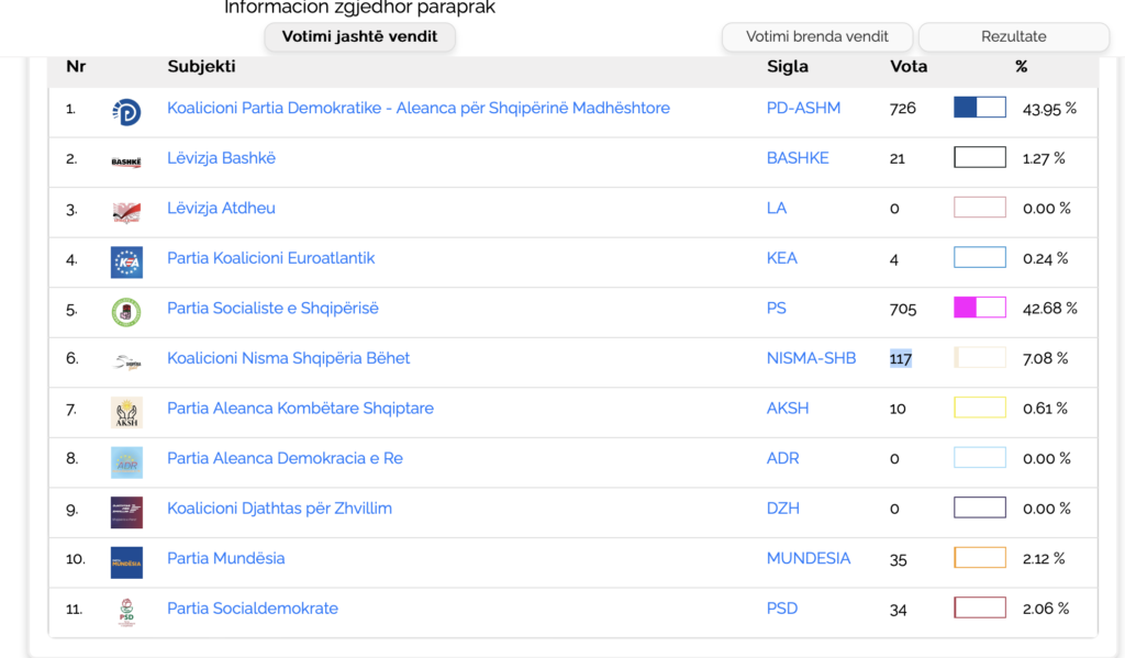 Ndërkohë, Nisma Shqipëria Bëhet ka siguruar 117 vota, Lëvizja BASHKË ka marrë 21 vota, MUNDËSIA 35 vota, dhe Partia Socialdemokrate (PSD) 34 vota.