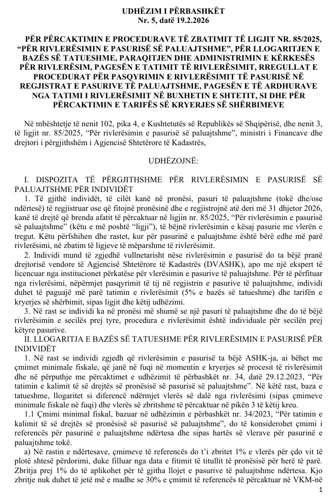 Rivlerësimi i pasurive të paluajtshme është tashmë zyrtarisht i zbatueshëm. Udhëzimi i përbashkët nr. 5, datë 19 shkurt 2026, i ministrit të Financave dhe drejtoreshës së Agjencisë Shtetërore të Kadastrës, i botuar në Fletoren Zyrtare, përcakton procedurat konkrete për zbatimin e ligjit nr. 85/2025 për rivlerësimin e pronave. Me këtë akt nënligjor, procesi kalon nga letra në praktikë.