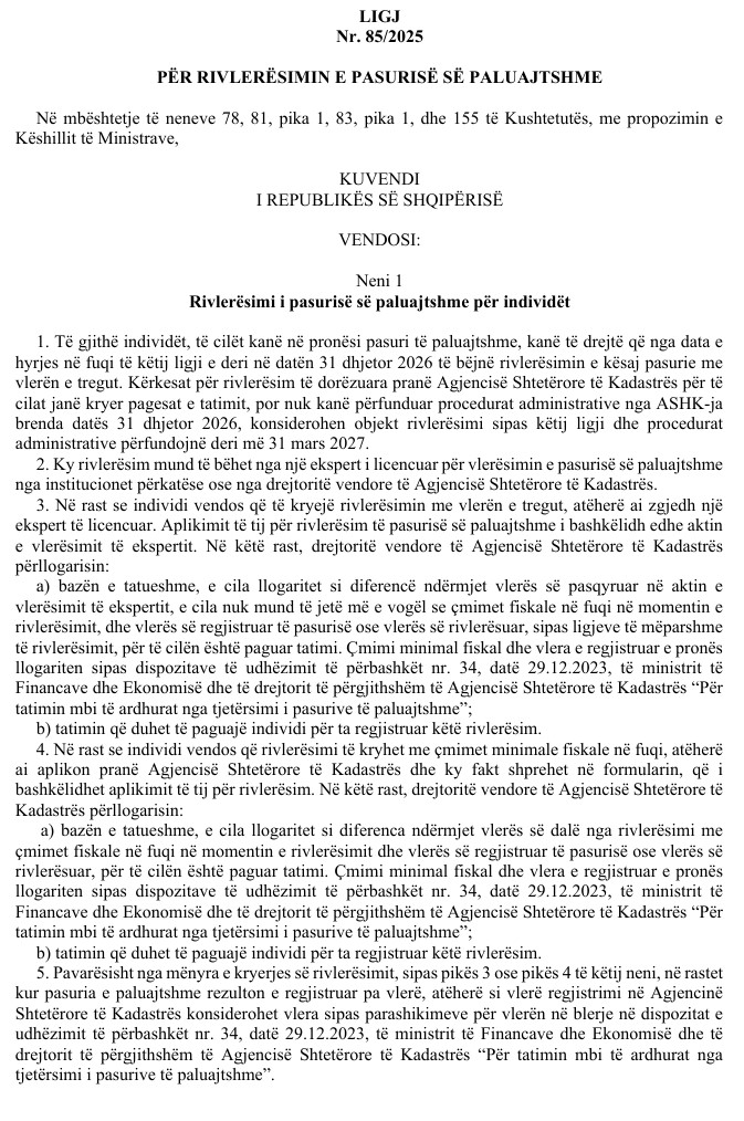 Në thelb, ligji u jep qytetarëve dhe bizneseve mundësinë që ta përditësojnë vlerën e pronës së tyre me çmimin real të tregut, duke paguar një tatim të reduktuar prej 5% mbi diferencën mes vlerës së re dhe asaj të regjistruar më parë. Afati për ta bërë këtë është deri më 31 dhjetor 2026.
