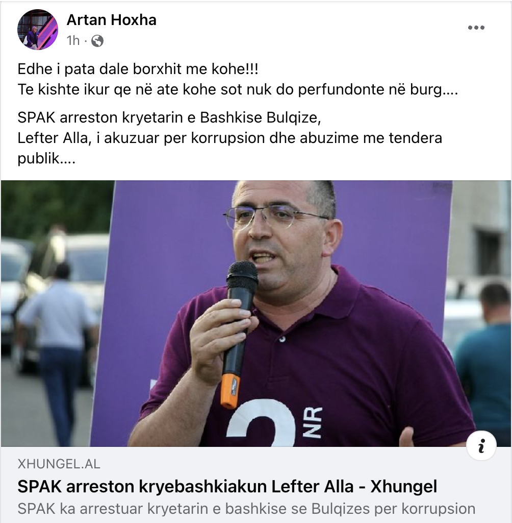 Gazetari Artan Hoxha ka reaguar pas arrestimit të kryebashkiakut socialist të Bulqizës, Lefter Alla. Në fakt ishte Hoxha ai që publikoi lajmin i pari per arrestimin e Alles.